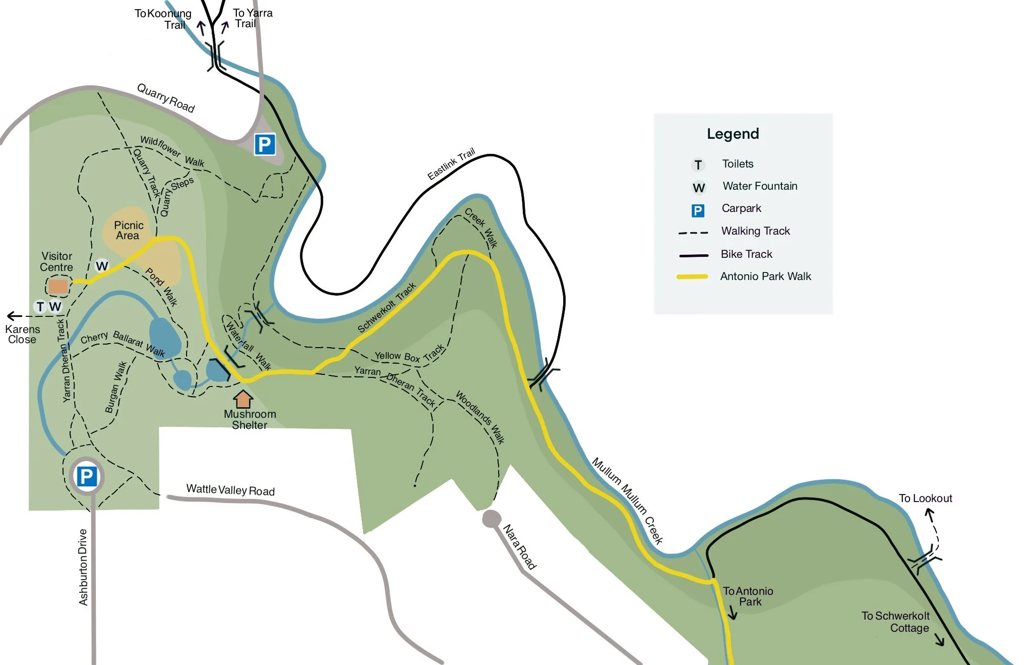 Continue along the circuit walk to reach an area called Antonio Park Newlands, where you can walk along the creek until crossing Wattle Valley Road to enter 21 Wattle Valley Road, now created by City of Whitehorse to form the Wattle Valley Park to create a link between Antonio Park and Yarran Dheran. Return along Schwerkolt Track.
