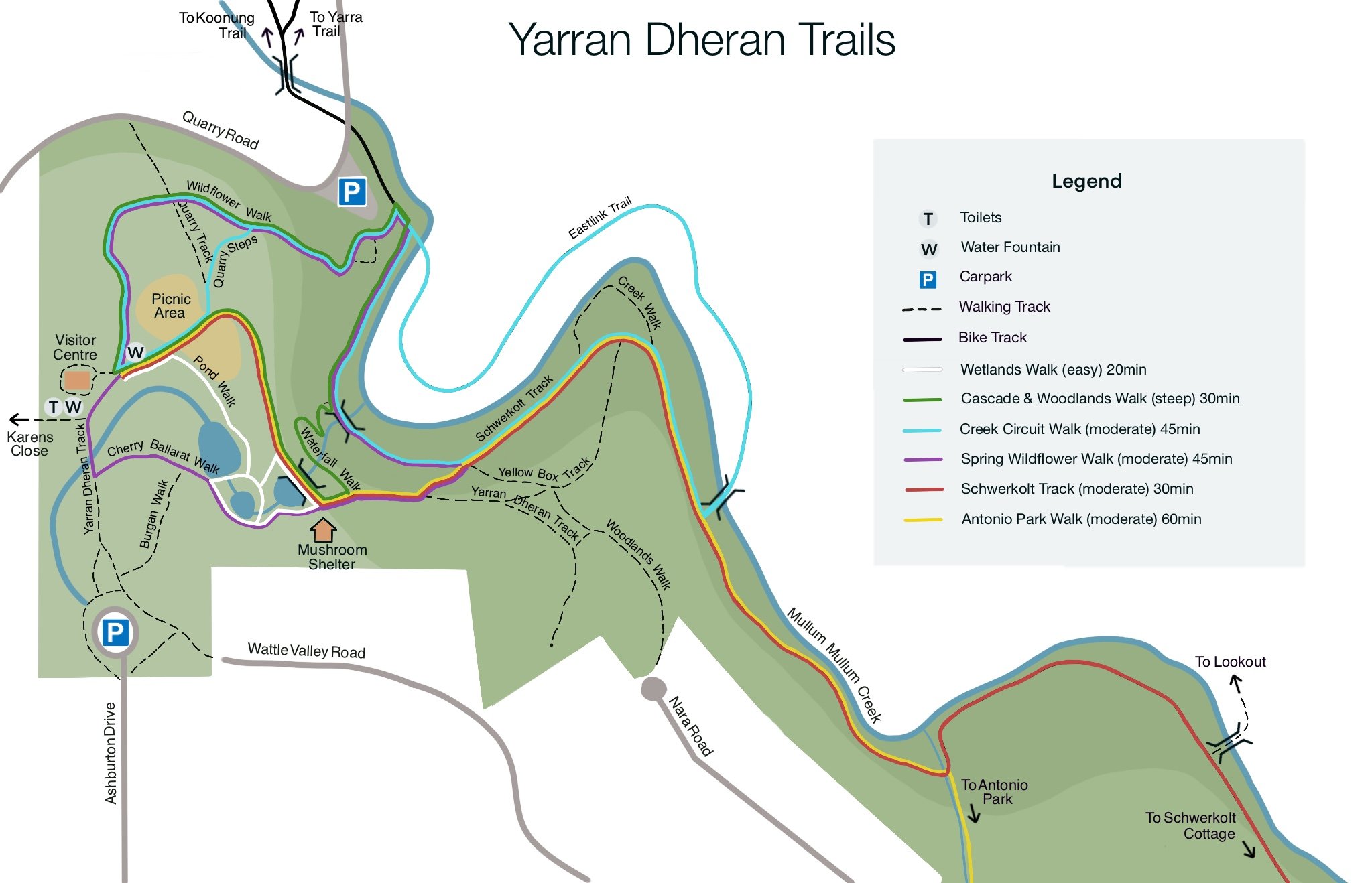 Take a variety of shared user paths from Yarran Dheran to enjoy longer walks, runs or bike rides and enjoy the bush on the way. Note that the following notes are general in nature and aim to provide an introduction only. You will need to plan your trip using more detailed maps.